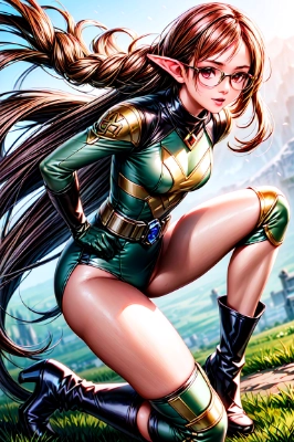 (photorealistic:1.4), (RAW photo), (RAW photo:2.0), best quality, 8K Ultra HD, glasses girl, Japanese, elf, green sailor suit, Power Rangers heroine, female, fighting, Yggdrasil background, masterpiece, best quality, ultra-detailed, highly detailed photo realistic, an extremely delicate and beautiful, light smile, like a sailor Heroine, long green braid, pink eyes, green sailor suit, masterpiece, best quality, extremely shiny super sailor green suit, extremely wrinkled super sailor green suit, extremely shiny puffy super sailor green suit, extremely shiny gloves and boots, high resolution, ultra detailed, masterpiece, best quality, shiny, clothes reflecting light, full sailor suit, , green hair, pink eyes, original character, girl, female knight, science fiction, anniversary, sword fighting, ruins, fighting, kneeling, one knee, a complete set, ,