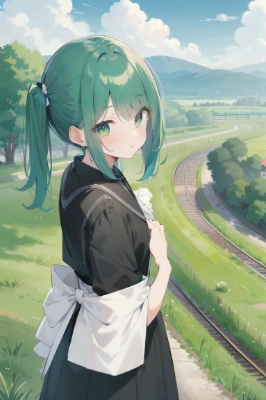 masterpiece, best quality, extremely detailed, anime, loli, (local train), short train, countryside scenery, single line train, old station, blue green hair, long twintails, wavy hair, pale green eyes, <lora:flat2:1> <lora:hairdetailer:0.3> ,