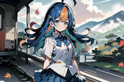 masterpiece, best quality, extremely detailed, anime, 1girl, solo, kwaii, (chibi:1.2), (riding on locomotive:1.2),BREAK,green shirt, brown and black skirt,BREAK,beautiful detailed face and eyes, happy, brown hair, short hair, hair between eyes, raccoon dog ears, black eyes,BREAK,(rail:1.5), (autumn:1.2), grass field, (mountain:1.2), ,