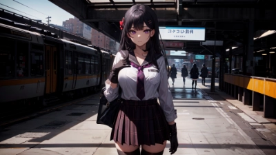 ( overcoat,school uniform, long sleeves, impossible clothes),(plaid skirt,black thighhighs),( red necktie, sailor collar,plaid scarf,leather gloves, hair ornament, green armband),