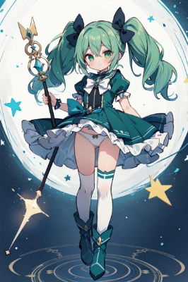 (masterpiece), (best quality), detailed,1 girl, soro, twintails, long wavy hair twintails.hairs between eyes,dark green eyes ,dark green hair, (magical girl:1.2),bow, dress, (pink:0.6), over legwear, boots, too many frills, too many bow, standing, white panties,magical stick, mechanical stick, magic cercle, frying,,