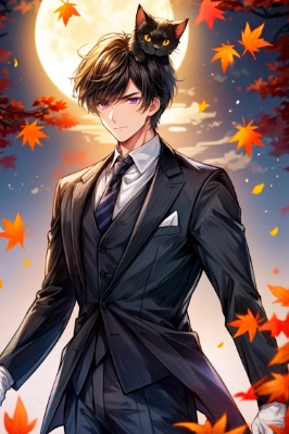 Masterpiece, high quality, super clear, super detailed, (((( male handsome man, adult age 30, )))), purple eyes, cool with suspended eyes, V-shaped eyebrows, body strong and fearless 8.5 head tall, 185cm, cold well-groomed black short hair to neck, (((bangs parted in thirds))), slender nose, expression lines, throat, clothes Black suit, black tie, (((cat ears on head))), cat ear gloves, fearless smile, night sky, <lora:flat2:-0.35> <lora:hairdetailer:0.85> ,,