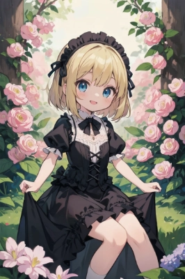 masterpiece, best quality, extremely detailed, anime, girl, blond short hair, smile, skirt, ((child)), solo, (kids model), model pose, Flowy floral dress with a light cardigan for those breezy fall days. Tights and suede ankle boots add a boho flair. Accessorize with a felt hat and layered bracelets.,