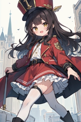 masterpiece, best quality, extremely detailed, anime, (fantasy:1.3), 1girl, (child:1.5), kawaii, solo, petite, spread arms,BREAK,oriental clothes, red dress, red vest, white frill skirt, red sash,BREAK,beautiful detailed face and eyes, happy, blush, orange hair, short hair, low twintails, hair over shoulder, flipped hair, ahoge, blunt bangs, orange eyes, hairclip, ball hair ornaments, BREAK,oriental village, mountain,