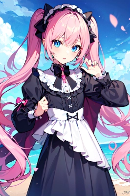 masterpiece, best quality, extremely detailed, anime, girl, skirt, child, lolita fashion, girl, twintail, pink hair, blue eyes, magical girl, fantasy, magic, flower,