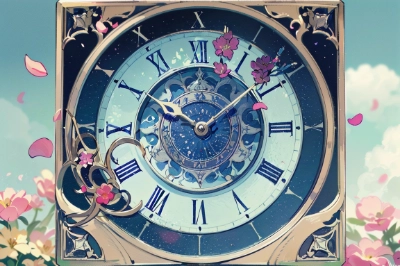 masterpiece, best quality, extremely detailed, anime, Tarot card decorated with crystal texture, The clock, clock Tarot Card, Tarot Card Style Frame, Art Nouveau, Ancient Greek Style, huge antique clock decorated with crystal and olive texture, Wreath, Blue Sky, Garden, Flower Arch, Petals,,