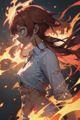 side face, profile, burning, fire, burning girl, flame shot, fighter, smile, fire, magic shot, attack, see teeth, long fire hair, striking, abs, burning background, big breats, fire on body, torn shirt, abs, burnt shirts <lora:kasshokuhada:0.4> <lora:shihaku-eye:1> ,