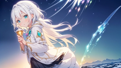 from side,dynamic multi action,dynamic tracking shot,8k,(High sensitivity ISO:1.8),(high saturation:1.5),(rule of thirds:1.8),(vivid color scheme:1.3),(ultra detail extremely scrutiny hand drawn anime style aqua water color streamline perfection illustration painting art),(beautiful dream lights:1.6),(ultra detail extremely scrutiny gradation clear sky dream Luminous illumination cty illumination Luminous art cgi effect background:1.4),(ultra detail extremely scrutiny WDR HDR Photoshop ultra best quality UP:1.5),(beautiful elegant vivid luster kaleidoscope vfx effect:1.4),(gloss Whitening fleeting tenderness innocence kawaii anime face:1.4),(smile:0.7),(Fluffy vivid colorful anime texture taste:-0.2)(snow-white skin milky skin:1.2),Fluffy medium-length silver hair,Fluffy medium-length vivid blonde hair,emerald eyes,Fashionable hood,(fine embroidery white blazer suit:1.2),(pleated skirt:1.2),cheerful,shadow light,illusion,mystic,mystery,carnival night,party night,,,cold winter breeze,muffler,globe,coat,north wind,space,(ultra detail extremely scrutiny gradation scenic overlook it's a beautiful night city world: Photoshop:1.5),night,mirage,phantom,bridge,,light white blue,panorama,galaxy,shooting star,tower,,<lora:add_detail:1> <lora:sharpen-soften:0.2>