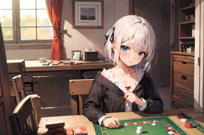 very cute female child,10 yo,white hair,bangs,medium hair,blue eyes,flat chest,