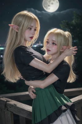 masterpiece, best quality, extremely detailed, anime, girl, skirt, child, girl, longhair, ahoge, wet hair, T shirt, blue hair, blue eyes, angel, succubus, original character, younger sister, dancer, fantasy, wing, summer, sunset, sweating, smile, blushing, embarrassment, star gazing, crying, laughing, happy, reaching,