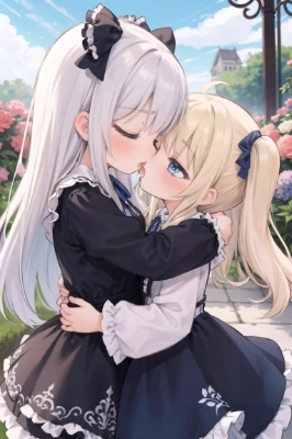 masterpiece best quality extremely detailed anime ((((little female child)))) ((loli)) ((toddler)) two side up long blonde hair long silver hair gothic lolita fashion ((frills)) long sleeves (closed eyes) floral garden from side embarrassed blush looking at each other kiss french kiss drool saliva hugging each other blue eyes beautiful landscape wide shot,