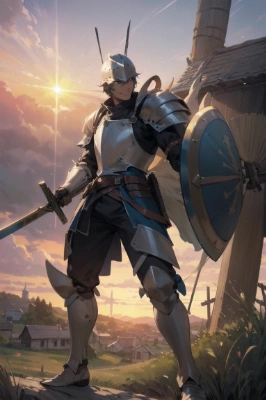 masterpiece, best quality, extremely detailed, anime,1boy,white lace up shirt,brown gilet,brown pants,medieval peasant,medieval connon people,very shorthair,a short bob,brown hair, brown eyes,smiling,Latin,Spanish,ransel,big basket,many swords in the basket,Supein,fantasy,hut of windmill,village,middle ages,sunset,