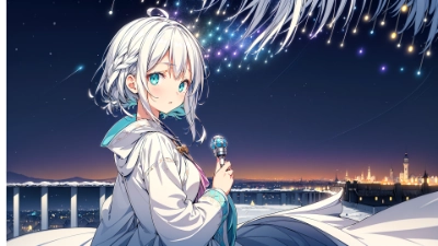 from side,dynamic multi action,dynamic tracking shot,8k,(High sensitivity ISO:1.8),(high saturation:1.5),(rule of thirds:1.8),(vivid color scheme:1.3),(ultra detail extremely scrutiny hand drawn anime style aqua water color streamline perfection illustration painting art),(beautiful dream lights:1.6),(ultra detail extremely scrutiny gradation clear sky dream Luminous illumination cty party venue illumination Luminous art cgi effect background:1.4),(ultra detail extremely scrutiny WDR HDR Photoshop ultra best quality UP:1.5),(beautiful elegant vivid luster kaleidoscope vfx effect:1.4),(gloss Whitening fleeting tenderness innocence kawaii anime face:1.4),(smile:0.7),(Fluffy vivid colorful anime texture taste:-0.2)(snow-white skin milky skin:1.2),Fluffy medium-length silver hair,Fluffy medium-length vivid blonde hair,emerald eyes,Fashionable hood,(fine embroidery white blazer suit:1.2),(pleated skirt:1.2),cheerful,shadow light,illusion,mystic,mystery,carnival night,party night,,,cold winter breeze,muffler,globe,coat,north wind,space,(ultra detail extremely scrutiny gradation scenic overlook it's a beautiful night city world: Photoshop:1.5),night,mirage,phantom,bridge,,light white blue,panorama,galaxy,shooting star,tower,lolita fashion,aerial photography,rooftop,firework,cake,drink,sit,chair,table,,<lora:add_detail:1> <lora:sharpen-soften:0.4>