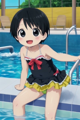子供っぽい水着はできませんが、セーラー水着ならどうにか再現できました。AIがトップスのサイドラインやボトムズのラインを表現してくれたのが嬉しいですね。