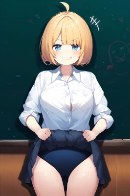 from front, 1girl, blonde hair, bob cut, blunt bangs, ahoge, blue eyes , tareme, holding up, grabbing own breasts, heavy breasts, gym uniform, buruma, blue sky, worried, closed mouth, looking down, tired, heavy breathing, sweat, cowboy shot, face focus, detailed eyes, {{{{{shiny skin}}}}}, game cg, anime screencap, , best quality, amazing quality, very aesthetic, absurdres