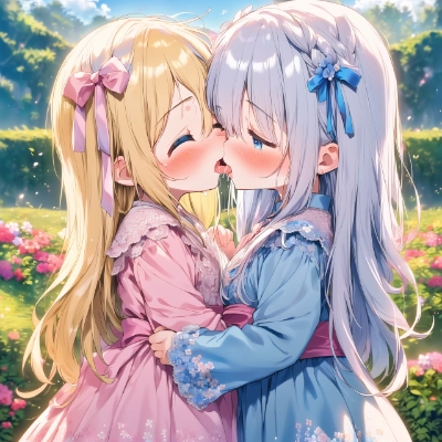 ((masterpiece)) (best quality) (beautiful detailed eyes) (ultra-detailed) (finely detail) (highres) 2girls ((((little female child)))) ((loli)) ((toddler)) two side up long blonde hair silver hair pink ribbon red long dirndl ((frills)) long dress floral garden embarrassed ((blush)) ((head on head)) ((closed eyes)) looking at each other kiss french kiss drool saliva trail hugging from side blue eyes beautiful landscape wide shot [full body]