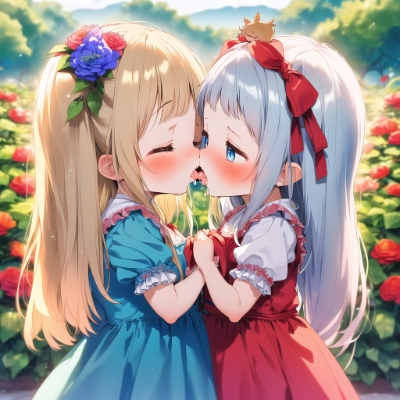 ((masterpiece)) (best quality) (beautiful detailed eyes) (ultra-detailed) (finely detail) (highres) 2girls ((((little female child)))) ((loli)) ((toddler)) two side up long blonde hair silver hair pink ribbon red long dirndl ((frills)) long dress floral garden embarrassed ((blush)) ((head on head)) ((closed eyes)) looking at each other kiss french kiss drool saliva trail hugging blue eyes beautiful landscape wide shot [full body] dynamic angle