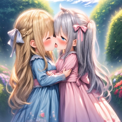 ((masterpiece)) (best quality) (beautiful detailed eyes) (ultra-detailed) (finely detail) (highres) 2girls ((((little female child)))) ((loli)) ((toddler)) two side up long blonde hair silver hair pink ribbon red long dirndl ((frills)) long dress floral garden embarrassed ((blush)) ((head on head)) ((closed eyes)) looking at each other kiss french kiss drool saliva trail hugging from side blue eyes beautiful landscape wide shot [full body] <lora:hyperdetailer_v080:0.5> <lora:hairdetailer:1>