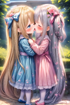 ((masterpiece)) (best quality) (beautiful detailed eyes) (ultra-detailed) (finely detail) (highres) 2girls ((((little female child)))) ((loli)) ((toddler)) two side up long blonde hair long silver hair white panties white camisole embarrassed ((blush)) ((head on head)) ((closed eyes)) looking at each other kiss french kiss drool saliva trail hugging from side blue eyes beautiful landscape wide shot indoors pink ribbon pink bedroom sitting on pink bed [full body] <lora:hairdetailer:1> <lora:hyperdetailer_v080:0.5>