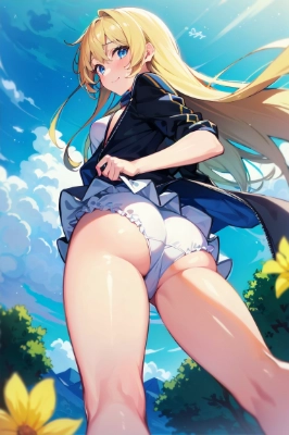 (masterpiece, best quality, ultra high res, 8k, perfect anatomy, extremely detailed), ((kancole)), (((shimakaze))),BREAK(1girl, cute girl, shiny body, shiny skin, small breasts), (long hair, blonde hair, brown eyes)BREAK(very short blue skirt), sullen, ocean,
