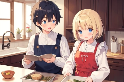 in a cozy kitchen room, a young girl and boy cooing, the girl with blue eyes, blonde short hair adorned with a red ribbon, the boy with black hair, both wearing comfortable long-sleeved winter clothes, lost in their thoughts, a peaceful and relaxed atmosphere, high-quality, ultra-detailed, serene, apron,(Masterpiece:1.25),(Best quality:1.25),(Ultra-detailed:1.1),(Illustration:1.05)