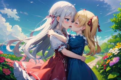 masterpiece best quality extremely detailed anime ((((little female child)))) ((loli)) ((toddler)) two side up long blonde hair long silver hair pink ribbon red long dirndl ((frills)) long dress (closed eyes) floral garden from side embarrassed blush looking at each other kiss french kiss drool saliva trail hugging each other blue eyes beautiful landscape wide shot,