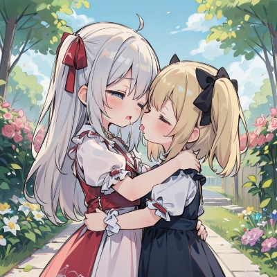 masterpiece best quality extremely detailed anime ((((little female child)))) ((loli)) ((toddler)) two side up long blonde hair long silver hair pink ribbon red long dirndl ((frills)) long dress (closed eyes) floral garden from side embarrassed blush looking at each other kiss french kiss drool saliva trail hugging each other head on head blue eyes beautiful landscape wide shot,
