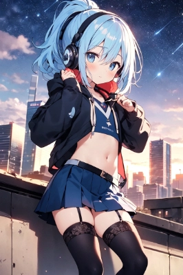 (Masterpiece, best quality), (detailed and beautiful eyes), (detailed eyes and detailed face), (landscape), (very detailed CG, super detail, best shadow), 8k, 4k, beautiful concept illustration, (Illustration), (Very detailed and beautiful), (Perfect in every detail), Age: 16 years old, Female, Ponytail, Blue hair, Light blue eyes, (Gray jacket), (Navel exposed), (Black T-shirt) (Shirt), Navy belt skirt, Navy socks, (Absolute area), Thigh garter ring, Black boots, Headphones, (Flat chest), (Facial expression: Smile), ((Stands and hands a bouquet of flowers)), (Future city) , (starry sky).,