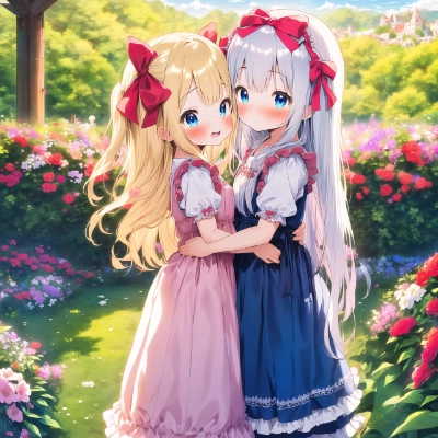 masterpiece best quality extremely detailed anime ((((little female child)))) ((loli)) ((toddler)) two side up long blonde hair long silver hair pink ribbon red long dirndl ((frills)) long dress floral garden ((from side)) embarrassed blush smile looking away looking at each other hugging each other head on head blue eyes beautiful landscape wide shot,