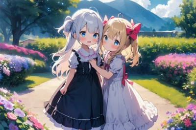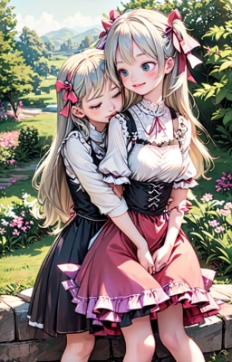 2girls {{little female child}} loli toddler 幼児 two side up ツーサイドアップ long blonde hair long silver hair pink ribbon white dress lace-trimmed embroidery long sleeves blue eyes smile sitting floral garden cheek to cheek from front embarrassed blush looking at each other