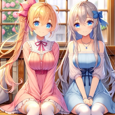 2girls yuri masterpiece best quality extremely detailed anime ((((little female child)))) ((loli)) ((toddler)) two side up long blonde hair silver hair pink ribbon red long dirndl ((frills)) long dress floral garden embarrassed ((blush)) (from side) cheek-to-cheek (looking away) looking at each other hugging blue eyes beautiful landscape wide shot [full body],