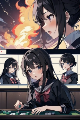 masterpiece, best quality, best quality drawn, ((an anime girl in black school uniform)), ((girl playin gmahjong)), dignified face, black hair, long hair, (gmahjong), black school uniform, (flames blowing up from arms), ((Lightning)), open mouth, (girl with Mahjong tiles), insanely detailed, Documentary, small breasts, ((four girl in school uniform behind)), (front view),
