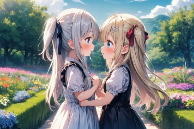 masterpiece best quality extremely detailed anime 2girls ((((little female child)))) ((loli)) ((toddler)) two side up long blonde hair silver hair pink ribbon red long dirndl ((frills)) long dress floral garden embarrassed ((blush)) (from side) cheek-to-cheek (looking away) looking at each other hugging blue eyes yuri beautiful landscape wide shot <lora:flat2:-0.3> <lora:hairdetailer:0.5>,