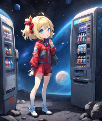 anime artwork, anime style,2d cel anime,girl in a Japanese city,loli,blond hair,short hair,hair red bow,blue eyes, standing by a row of vending machines, wearing long sleeves with a coat, looking thoughtfully at the vending machine, trying to decide what to buy, high quality, ultra-detailed, masterpiece