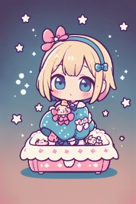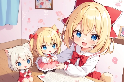 loli,blond hair,short hair,ahri bow,red bow,blue eyes, girl playing with dolls in a cheerful children's room i surrounded by bright wallpapers and playful posters, dressed in comfortable long sleeves, expressing joy and happiness, high quality, ultra-detailed, masterpiece