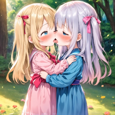 masterpiece best quality extremely detailed anime 2girls ((((little female child)))) ((loli)) ((toddler)) two side up long blonde hair silver hair pink ribbon red long dirndl ((frills)) long dress floral garden ((embarrassed)) ((blush)) smile face to face (from side) (looking away) looking at each other hugging each other blue eyes yuri beautiful landscape wide shot <lora:flat2:-0.3> <lora:hairdetailer:0.5>,,
