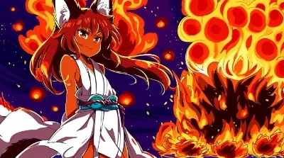(2D:1.2),(solo:1.2), brave girl, (dark-skinned:1.3) girl, ((simple:1.2) Japanese miko:1.2), fox ears, (_color_ hair), small chest, detailed face, cool face BREAK (cloud:1.4), expansion,