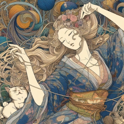 (masterpiece), (best quality), (ultra-detailed), 黒い髪で黒い瞳の球体関節人形を糸で操る招き猫, Meiji era style, 竹下夢二風イラスト, <lora:flat2:-0.7> <lora:hairdetailer:0.7>