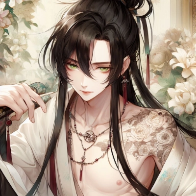 アニメ。イラスト。水彩。繊細。Intricate。複雑。男性2人。2male。古代中国の漢服。長い黒髪の緑目の青年。長い黒髪で赤目の子ども。緑目の青年の膝に赤目の子供が座る。幸せな顔。お互いを見る。中国の庭園