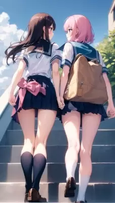 (two school girls walking side by side on stairs:1.3),thighs,(back of knee:1.3),wearing black pleated skirt and socks white socks and black loafers,(from below:1.2),(closeup to viewer:0.9),(looking each other:1.3),