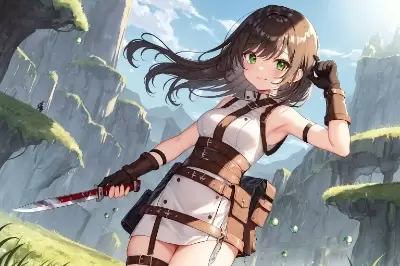 (masterpiece)++, (best quality)++, (great)++, illustration, short brown hair, green eyes, delicate eyes, sleeveless, glove, white dress, black corset, red miniskirt, red ribbon, medium breasts, open shoulder, delicate cute face, kawaii, delicate hair, floating hair, shiny hair, shiny skin, delicate clothes wrinkles, backlight, belt on waist, smile, A vast expanse of grasslands and mountains, lipstick, leather armor, waist belt, waist pochette, knife in hand, round slime, wandering slime, many slimes, battle with slime, slime