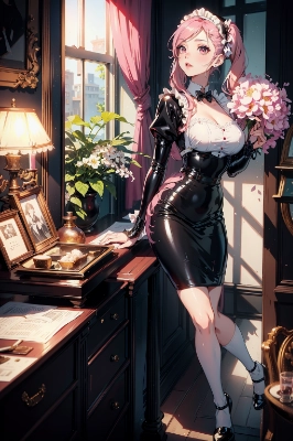 A woman taking a walk with a piglet in the park in the morning, black luster latex maid outfit, pencil skirt, white frilly maid hairband, Ulzzang-6500-v1.1:0.1, masterpiece, ultra detailed, detailed beautiful skin, detailed beautiful face, petite figure, detailed skin texture, detailed hair, brown hair, gray eyes, pastel painting,