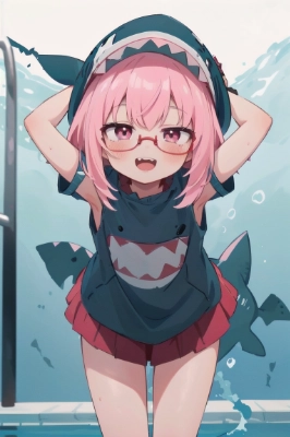 masterpiece, best quality, extremely detailed, anime, 1 female child, solo, (wearing a shark-head headwear and arms up), pink eyes, pink hair, open wider mouth, (shark teeth:1.3), (red round shaped eyeglass),swimsuit with frills, leaning forward, grin , in the pool , wide shot, <lora:boldline:0> ,