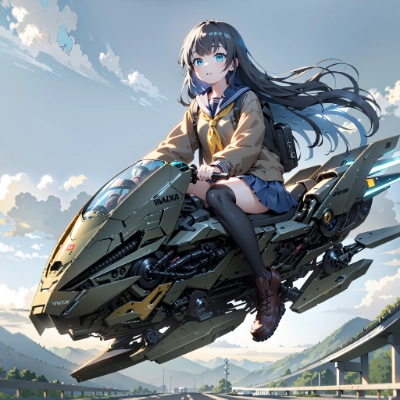 Create a high-resolution anime-style watercolor illustration of a girl in anime style, riding a narrow, angular sci-fi mechanical vehicle resembling a flying fish, viewed from the front with her upper body in close-up. The vehicle features a narrow, elongated seat on its top, with the upper part significantly indented. The girl is straddling the vehicle in a forward-leaning position. The vehicle's width is very narrow, about 50cm, navigating through a backstreet of a city in late autumn, surrounded by brick buildings. The front of the vehicle tapers to a point and includes headlights. The vehicle is metallic pink with some paint chipping, and emits a faint blue glow from its underside, resembling repulsion energy. It's morning. The girl is wearing a school uniform and coat, a scarf for warmth, and her hair is shoulder-length blue with a hint of purple.