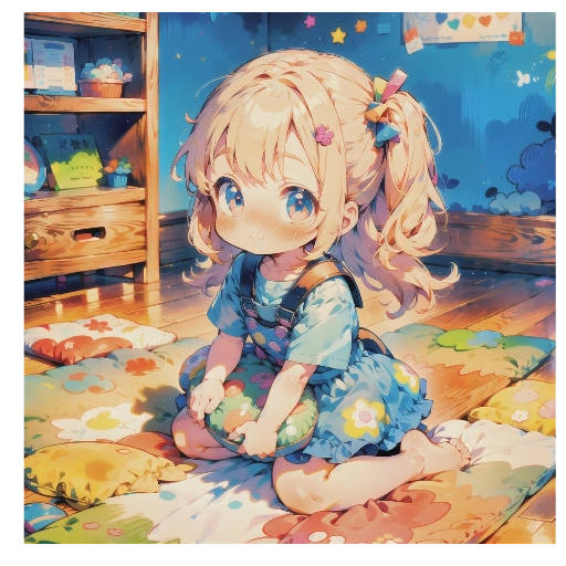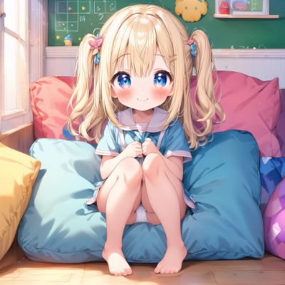 masterpiece best quality extremely detailed anime ((((little female child)))) ((loli)) ((toddler)) ((preschooler)) two side up long blonde hair smock blue shirt short sleeves indoors colorful kindergarten colorful preschool sitting on colorful cushion embarrassed ((blush)) smile closed mouth full body barefoot [[blue eyes]]<lora:flat2:-0.5> ,,,