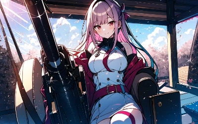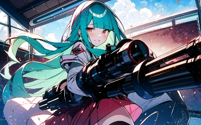 long hair, wavy hair, dark blue galaxy translucent ombre hair, red eyes, sailor school uniform, open mouth, single fang, cute randoseru backpack, surprised, smile, frills