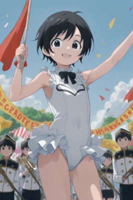 masterpiece, best quality, extremely detailed, anime, young girl, chubby body, huge breasts, fair skin, large size, color guard, sleeveless blue one piece, ponytail, black hair, black eyes, smile, happy, dancing, in parade,,,