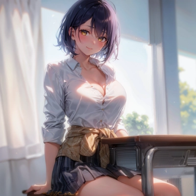 hires, cinematic angle,beautiful face,finely detail, masterpiece, best quality, ultra-detailed,Photorealistic,8k,lens flare,intense shadows,Studio, dreamy washes,beautiful detailed glow,colorful refraction,1girl, solo,cowboy shot,looking at viewer,<lora:raidenshogun1-000009:0.6>,(raiden shogun:1.0),(purple eyes,braid,purple hair,long hair,blunt bangs,:1.3),(mature,30 years old:1.3),large breasts,cleavage,seductive smile,(sitting on chair,crossed legs:1.1),(detective wear,suit,skirt,black_pantyhose,:1.2),(modern detective’s office,table,chair,bookshelf,shelf,book,:1.2),light,golden hour lighting