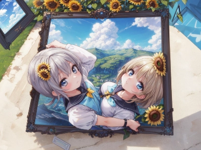 outdoor, carry bag, sunflower,blue sky, sunshine,cumulonimbus, from above,