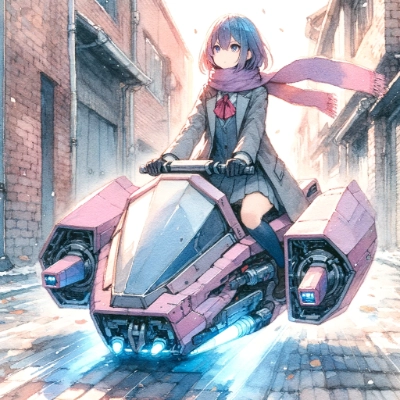 Create a high-resolution anime-style CG painted illustration, featuring a close-up of a girl's expression. The girl is riding a slender and elongated sci-fi mechanical vehicle, similar to Sanma but with a more angular design, viewed from the side. The vehicle is dark metallic yellow and green with peeling paint. She is wearing a school uniform and a lab coat, with long blue hair that has brown highlights. The vehicle has a jet ski-like seat, and she is sitting astride it, floating. The background is the sky above a mountain road at midday, in a wide format. The focus is on capturing the girl's facial expression in detail, set against the backdrop of the sky and mountain scenery.